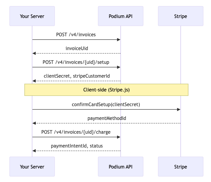 This step happens entirely on the client side. Use Stripe.js to collect the card details and confirm the SetupIntent. Card numbers are sent directly to Stripe and never pass through your servers or Podium's — keeping you PCI compliant.